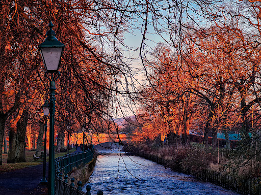 Playpark for little and bigger adventurers. Nest swing, monkey swing on a go-around, climbing tower with tunnel slide... For the little ones 2 swings, seasaw, climb-and-slide and a surrounding grass area enclosed by a hedge. Beyond is a "dog-range" where most people run their dogs and others occasionally play soccer. Lots of benches in the park for picnic. There's a band stand that's used every so often. Cupar on bloom provides the most beautiful flower arrangements in the flowerbeds, so each season is a joy. The park is used for community activities (Duck Race, Christmas Tree...). Watch out: at times the park gets flooded, if the weather is nice the play park fills up quickly and can feel overcrowded. In this case take a stroll down the paved path along the Eden and when you're back there's probably a space for you...
