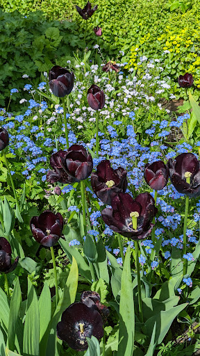 This is an absolutely wonderful garden with beautiful planting, superb colour combinations and a thoughtful layout. It was so peaceful wandering around on a sunny Tuesday in early May and although some of the tulips were starting to go over their colours were as vibrant as ever, many of them contrasting with the blues of Brunnera and Camassias in the woodland area and, cleverly with the blues of Forget-me-nots closer to the house. Rows of iris will look stunning when they begin to flower so pay...