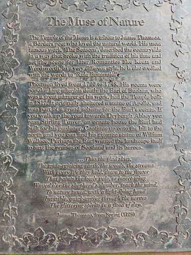 An interesting free to enter folly by the River Tweed at Dryburgh. Built by the 11th Earl of Buchan David Erskine as a tribute to the poet James Thompson who wrote the lyrics to Rule Britannia. The muses are traditionally the goddesses of science literature and the arts. Erskine was the founder of the Scottish Society of Antiquaries and lived nearby at Dryburgh Abbey House. In 1814 he erected the adjacent colossal statue of...
