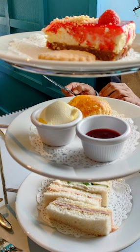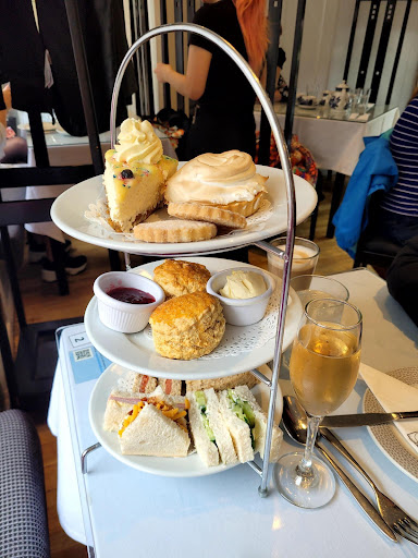 Not impressed. We didn't have a reservation but were seated immediately upstairs. Now, me and my fella aren't the smallest of people and despite there being 3 empty tables along the back wall, the woman sat us at a round table right in the walkway from the kitchen to the cafe floor. As such, my chair was getting brushed every time someone went past. That's a small issue. My bigger issue is with the service. Yes we were seated quickly and our order taken relatively soon after, my tea-cup was brought to the table.....and then we were then left waiting for almost 25 minutes for our food. For a tea, a coffee and 2 scones. That is a ridiculous wait time for a very simple order. I thought that maybe the food was coming out in order of which table ordered first - until a table after us were served their kitchen prepared food before us. I was ready for walking out as finally our drinks arrived. His saucer was dirty, my saucer was dirty, the scones didn't taste fresh, mine was very chewy, stingy with the jam which was runny. Nobody spoke to us from placing the order to the order arriving, not even to check in and say it wouldn't be long. Nobody came back to check if everything was ok when we finally got our order. Just all in all a very poor experience. Having worked in hospitality myself for many years, I feel you need to train your staff to be more efficient. There were at least 6 different waitresses on the floor in the time we were there. For around 45 covers? I used to handle 60-70 covers by myself. They are running backwards and forwards to the same table with various items in their hands - 4 glasses of prosecco, 2 teapots per hand, 2 waitresses to the same table at the same time with 3 items between them. Use trays. More efficient and much safer. I still won't be...