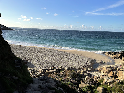 It's quite a walk to Portheras from the Pendeen lighthouse car park but worth it on a lovely day, as we had. From other people's photos there would appear to be a lot more beach when the tide is out but there's still plenty even when it's in. The sand was a lovely colour and texture, the sea a beautiful turquoise and Azure blue. We did lose the sun, behind the cliffs, a little higher up the beach mid-afternoon but there was still plenty of beach left. If the tide is out then I imagine that would be less of a problem anyway. It was far less crowded than other beaches, eg Porthcurno. It is a bit of a scrabble down to and up from the beach, so perhaps an idea not to go too loaded down with gear unless there are plenty of...
