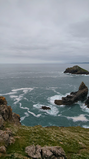 This stunningly beautiful North Cornwall coastal location is reachable with care by narrow inland paths and is a National Trust and RSPB place of interest. Formed from basaltic rock it is the site of a 200 years BC iron age fort from which remnants of pottery and tools were excavated during archeological activity in the mid twentieth century. Laurence Binyon was inspired to compose his timeless war poem "For the Fallen" during a visit to the area in 1914. Wonderful cliff top views out over the white foam tipped waves of the Atlantic Ocean with occasional glimpses of dolphins and seals. A hearty hike to get here but well...