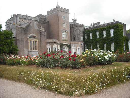 The original building on the site was a fortified manor house, the appellation "castle" was added probably no earlier than the 17th century. The building has never been a true castle, that is to say with a keep and moat, although it did possess a curtain wall and yard on the east side (now the rose garden) as shown in the 1745 engraving by Buck. Leland mentioned a barbican or bulwark in this area, but these were demolished as part of the 18th-century landscaping works designed to provide an uninterrupted view from the lower rooms towards the Exe Estuary. Many castle-like elements on the west front (main entrance) were added in the 19th century. The gatehouse was built between 1845–47 to a design by Charles Fowler. The tall rectangular structure beyond with a tower to the north is essentially the original fortified manor house. The projection from the lower storey to the north in lighter stone with three Gothic-style windows is the Victorian dining hall,...