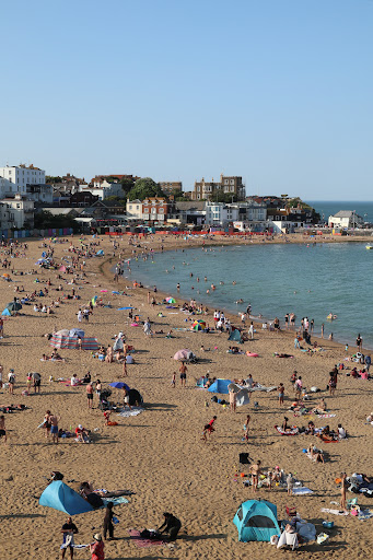 Typically pleasant British beachfront with numerous options for food and drink, including reasonably priced fish and chip shops. The beach is sandy with some rocky parts a little further into the surf. Lots of seaweed grows at these points, and the beach can be rather green - but it's perfectly safe to swim. There are the typical seaside amenities nearby, such as shops and stalls selling beachwear, buckets, swimming gear, etc. It gets very crowded at peak times. My photo shows the end of the day when most people have already left - and it's still busy. Safe for families with children but is quite loud, as it attracts a lot of large groups, teenagers and Bluetooth speakers. For a quieter visit, try Stone Bay just a few mins walk Northward along the coast. Stone Bay has only a single vegan (I think!) beach shack for food, but it's far more peaceful and much...