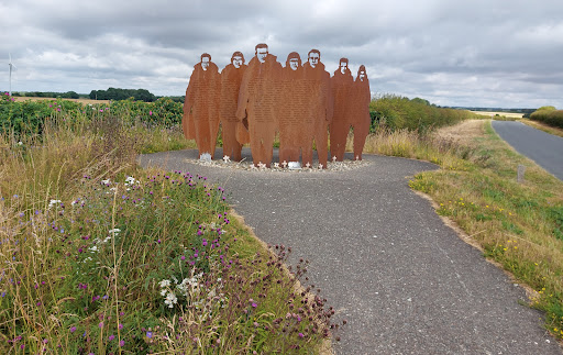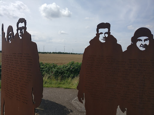 Lovely, eyecatching memorial to 158 Squadron, designed by artist Peter Naylor. It stands magnificent + proud, yet poignant, on the roadside, on the site of the former RAF Lissett airfield. Novera Energy built a wind farm here, with its project's tagline "Propellers back at Lissett". Of the twelve wind turbines, eleven are named after aircraft: Friday the 13th, Lily Marlene, Jane, Git up dem Stairs, Goofy's Gift, Xpress Delivery, Zombie, Minnie the Moocher, Blondie, the Menace + Maori Chief. The 12th turbine commemorates the six airmen who died in an explosion in the bomb dump on 2nd July, 1943. The seven 8ft tall airmen are constructed from 15mm thick steel. On both sides of the figures are the names of all 851 members of 158 Squadron who died. The squadron's insignia is echoed in the ground at their feet. The sculpture stands in a mini wildflower meadow, with a memorial bench alongside. There is also a visitors' book that you can sign. It's tucked away in the compartment on the sign stand, even has pens in the packet. I thought that was a nice touch. Brave men + women, deservedly honoured in this moving tribute. RIP....