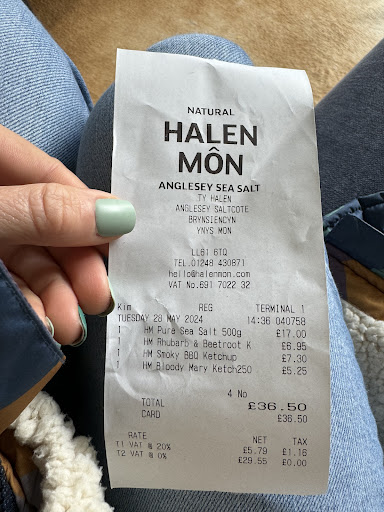 The products for sale at Halen Môn shop are expensive. I’m not saying they’re not good value, but they are very Spenny. 500g of their sea salt cost £17 today (28 May 24). I honestly had a word with myself paying that much for salt when I got in the car… I certainly will think again about that. Some of the sauces are over £7/bottle (small). So even though it’s nice stuff, it’s seriously luxury end stuff. You can buy smaller packs of salt etc to take a memento home for much less tho.