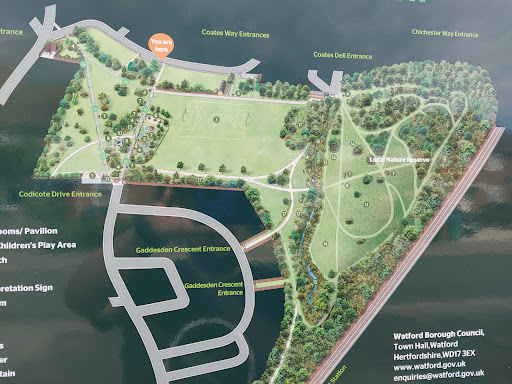 I've lived in Watford 40 years but only found this place the other day! Hidden away behind St Albans Road, parking is easy and there are plenty of entrances from surrounding roads. It's a surprisingly large open space, with well kept (if currently muddy, as is everywhere) open spaces / pitches; well-equipped playgrounds, suitable for everyone from toddlers to teens, and becoming progressively "wilder" as you go further back. Cross the stream into the nature reserve area, which includes open and wooded areas. Squirrels, foxes, bats and badgers all live here. Although it's very close to the M1 the terrain and trees keep it pleasantly quiet. Level access into the park, with recently re-paved paths make it ideal for the less-able, and even in lockdown there's plenty of space...