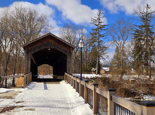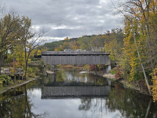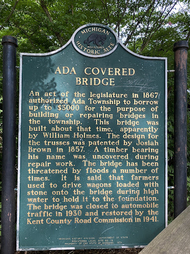 Read moreThis site was added to the historical registry in 1969 and a marker was erected in 1974. It states: "Ada Covered Bridge - An act of the legislature in 1867 authorized Ada Township to borrow up to three thousand dollars for the purpose of building or repairing bridges in the township. This bridge was built about that time, apparently by William Holmes. The design for the trusses was patented by Josiah Brown in A timber bearing his name was uncovered during repair work. The bridge has been threatened by floods a number of times. It is said that farmers used to drive wagons loaded with stone onto the bridge during high water to hold it to the foundation. The bridge was closed to automobile traffic in 1930 and restored by the Kent County Road...
