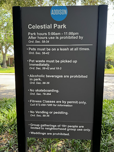 Celestial Park is one of my favorite chill places to relax, meditate and contemplate. Its a small neighborhood park in Addison. There is a walking/jogging trail with a nice grassy meadow area surrounded by mature trees and foliage.
