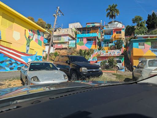 "Casas de Colores" which translates to "Houses of colors". This is a beautiful neighborhood of houses tucked on the hill (Cerro Cabrera) above Rompeolas Beach in Aguadilla that has been painted in murals and mosaics by an organization called Proyecto Pintalto and the local residents. It's beautiful with history and many photos opportunities! Please be mindful as families do live in these houses. They are friendly and love to see the tourists though. Some enjoy talking and answering questions. It free to visit. There is parking down by the beach and you can walk up. There is also a beautiful old engish style park called El Parterre park it sit at the bottom of the painted houses. I definitely recommend...