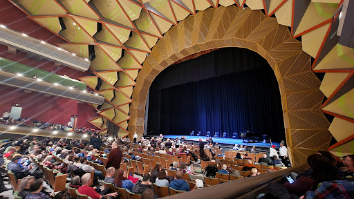 One of the many memorable highlights of the PAC is the original flower poppy-print carpet featuring oranges and reds covering the floor as the neutral-colored walls and vaulted ceilings above create a sense of retro grandiosity to this day. This is juxtaposed by a simple, geometric interior, slate grey walls, balconies, and stairs which are open in the center at each floor landing, allowing for a more roomy, but at the same time, intimate atmosphere. Refreshment and snack stations are conveniently located on either side of the main landing where guests may socialize before and between acts. Greeters and ushers are pleasant and will kindly guide guests to their seats in a prompt manner. If guests arrive late to a show/concert, ushers seat them in a row reserved for this purpose so they can still enjoy the entertainment before a break when they are able to be seated in their original assigned seats.
