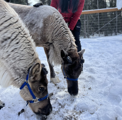 After warming up in the yurt with Cartel and Boone, we learned about the difference between reindeer and caribou with Kalyn. After a knowledgeable explanation, we went to walk the reindeers through a snowy forest (Boone wanted to join us). Sappho and Pilot, the reindeers were both cute and had a huge appetite. Throughout the walk Kalyn took amazing photos of us and talked more about the reindeers that she owned.