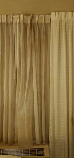Te curtains and carpert were filthy and had burn marks. The toilet didn't flush, the tub was clogged and there was a used wash cloth hanging from the curtain rod from a previous guest.