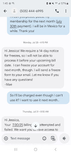 The instructors are amazing but customer service is not. See below how they respond for proof. I left to mexico to help my grandmother! I'm back in the states as of yesterday due to my daughters being sick and this is what I also have to deal with on top of it. Thank you for proving my point. Contract over the person. They would rather have you pay a WHOLE month you can't go and pause the month you can go. Then ignore you. I have paid so many $15 and $20 fees when I canceled a class to late or missed over my kids or illness.