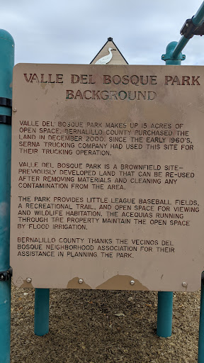 The park is nice. It has tables with a covering. Good for parties. Basketball court, playground,Baseball field. Grass is nice and green. Also, there is a nice long walk path for runners, just a nice walk. It's nice to take your animals for a walk. There is one Porta potty. Tables along the way to sit and relax. Also, you can get to the Bosque from the back. It was nice. Something for everyone....