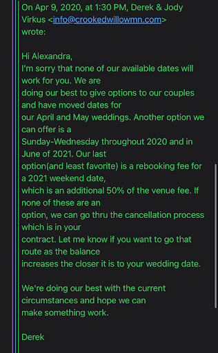 If you are looking for a one of a kind wedding experience, then look no further than Crooked Willow. It isn't just the views and scenery that is one of a kind; Derek and Jody Virkus represent what wedding venues should be. My wife and I had a few venues scheduled to be toured the same day. We came to Crooked Willow first, and within 10 minutes of meeting the Virkus' we knew we were not going to get married anywhere else. Their quality of service matches the quality of character. They were fair with price and flexible with payments. The bar staff was efficient and friendly. Although we were the clients, they made us feel in charge. Whatever we needed or wanted for our special day was accommodated, within reason. They even helped us with some of the decoration ideas. The day of the wedding, they were present from the start of the day, til the end. Throughout the day they were always a call or text away. There was never a time where this felt like a business exchange. This truly felt like we were getting married on a relative's property. I would highly recommend Crooked Willow as a wedding venue to anyone and everyone. Even if their wedding venue didn't include the one of a kind sights, I would still choose them because of how well they took care of me and my bride.