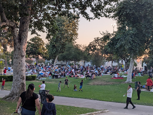 Fun event, parking is not bad provided you go a little early. But even at the start of the event (7pm) parking could be had less than 2 blocks away (of course this will vary depending on the movie). Seating is trickier, as the screen is surrounded by a gentle slope forming sort of a natural amphitheatre, the good flat areas will be taken early.