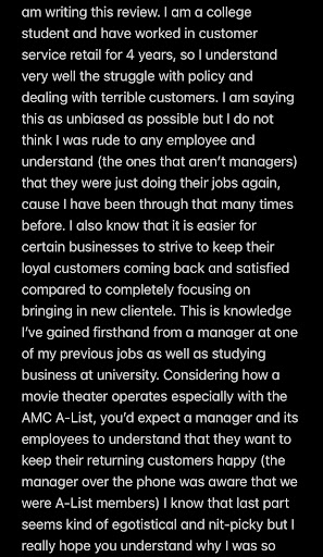 I understand the basic rules being that we cannot enter to see a movie with the weekend curfew without a physical form of identification showing that we are over the age of 18, but concerning my situation, the AMC Altamonte staff provided us with the worst possible experience to help us solve our problem. I came in as a total group of 5 people to watch a movie for a birthday celebration on Sunday, August 19 at 7:30. All of us are part of the AMC A-List which means we are at the theater often. By mistake one of my friends forgot to bring her ID to the theater and the staff did not let her in after the rest of the group had already gotten their tickets scanned. I had rushed to the bathroom quickly so I did not know what happened until I came out and one of my other friends told me. I ushered my other friends to just go and enjoy the movie while I went to approach the attendant who was scanning tickets and checking IDs. I did not catch her name but she was around middle-aged and was quite tall. I explained how we were all the same age (in the same year of university) and pleaded if we could just let her pass with a photo of her ID which my friend had pulled up on her phone already. Two other attendants came to see what was going on and neither of them could help us either which is understandable considering that they told us that we could not enter without a physical form of identification. Just to be clear I did understand the rule, but I was trying to reason with them based on our situation and ask if there was any other way she could be allowed into the theater. I also get that she was only doing her job but during the whole conversation, the attendant was speaking to me very rudely. Also, it was pointless for us to go back to her house and pick up her ID since the drive is 30 minutes each way which would lead us to miss the movie. At one point I asked something along the lines of “Do you just expect us to leave her outside for 2 hours while the rest of us see the movie?” She didn’t seem to have an answer to that because well yes, it doesn’t make sense to leave someone outside. She responded something like, “I guess so, but that’s up to you guys to figure out.” Just to be clear I asked this question so she could put herself into my shoes and see how ridiculous it was to not allow her into the theater cause she still had a photo of her ID. Regardless of that, even if my friend was under the age of 18, it was extremely unsafe of her to imply that we should leave a CHILD outside while everyone else went to see a movie. I was honestly just baffled and wasn’t leaving my friend on her own so we went outside and looked online to read the rules of AMC regarding identification. Stating word for word on the website, “At the manager's discretion we will accept a photograph of a valid ID so long as the picture and date of birth are visible.” After reading this statement I called the theater in hopes of talking to a manager. After speaking to an employee who picked up the phone he passed the phone to the manager where I explained the situation and read out the rule to him that I pasted earlier. I did not catch his name but he was male. He was also extremely rude to me when I asked him if there was any way he could accept the photo she had saying, “Well I am the manager and my discretion is that I am not accepting your photo ID.” As I stated before, with our current situation at hand this seemed like a pretty bad way to take care of this as a manager. I then asked if there was any way to refund the movie reservation since our tickets had been scanned we still weren’t able to go watch it. The manager explained this process to me but I still haven’t been able to get my reservation back. This may seem a bit off-topic but it might give some insight as to why I was so ticked off about this whole thing and now am writing...