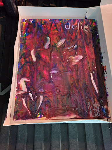 We tossed paint around and had a great time. They let you paint a canvas to take home. When we were done, they came and got our paintings to box them up so we could take them home. They are obviously still wet at this point.