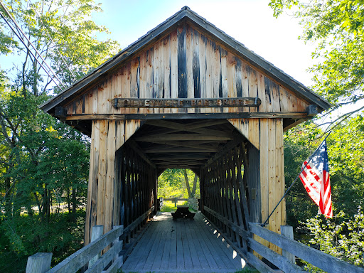 A surprise while I was actually traveling to another location! For me, New Hampshire cover bridges are like a fun scavenger hunt! This bridge is closed on the inside! But, you can still stop and visit. There is a small Trail next to it that leads underneath the bridge π΅ downtown! It is where I took a walk! π΅ Oops! π¬ Sorry! π Anywho! There is a memorial flag on the side of the bridge. There is also a nice view of the river that goes underneath it. If you're into covered bridges, It is worth a stop to check it off your list! It is Bridge #16 on the list of NH...