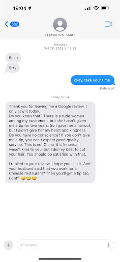 Here are the facts: Tipping — You told us the $65 charge included everything and no tip was required. We followed your instructions. Later insulting a customer for doing exactly what you said is unprofessional. Tipping is a voluntary bonus for good service, not a demand. Misrepresenting this demonstrates a fundamental failure to understand customer service. Harassment — Contacting a customer privately after a review is harassment. Any response to criticism must be professional and public. Personal attacks are completely unacceptable and could have legal consequences if they continue. Racism — Comments about my wife’s or my ethnicity are discriminatory and intolerable. Bringing race or ethnicity into a customer interaction is unethical and unprofessional. Service failure — The review reflects a deeply disappointing haircut. My wife had just given birth and requested her hair to be dried to avoid getting sick. Refusing this simple request is unprofessional and unacceptable treatment of any customer, particularly a new mother.
