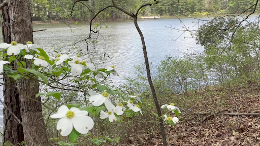 My wife spotted a variety of birds around the lake, as we walked. ( Not really a hike) She noticed 5 or 6 times Great Blue Herron standing along the shore “fishing”, 1 Herron swallowed a 6 or 7 inch fish in 2 gulps! Several parties of Mallard ducks swam. One scared little garden snake froze on the walkway, as we stepped over him/her! Mother Nature pushed trees to unfurl their new spring leaves. ( No spring leaves at home in Maine, in April)