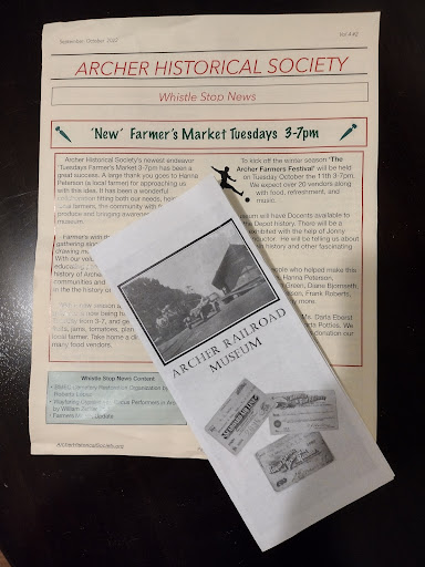 Archer Historical Society hosting a weekly FARMERS Market Tuesday's from 3pm-7pm located at the Railroad Museum grounds. You will find local produce and other homemade items like jams,jellies and honey and sometimes baked goods. Handcrafted items are new to the market which includes jewelry, knitted and crochet products, custom knives and other items. Hot food is available for a late lunch or early dinner. Come by and check out the latest offerings from local vendors. New vendors...