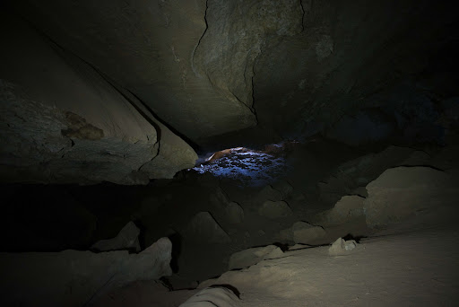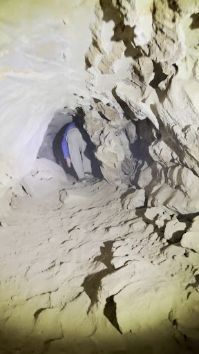 The trail first drops down across rock smoothed by others who have entered before us. Then at the bottom it went slightly up, we stayed to the left where you see the cave drop a bit more. Disregard the tube on the right and follow the dirt under a ledge that allows you to continue back. The cave narrows, and then opens up in the final room where the formations are visible. Go all the way to the end to get an up close of a formation and turn your light off to see the faint light coming through a small air shaft.