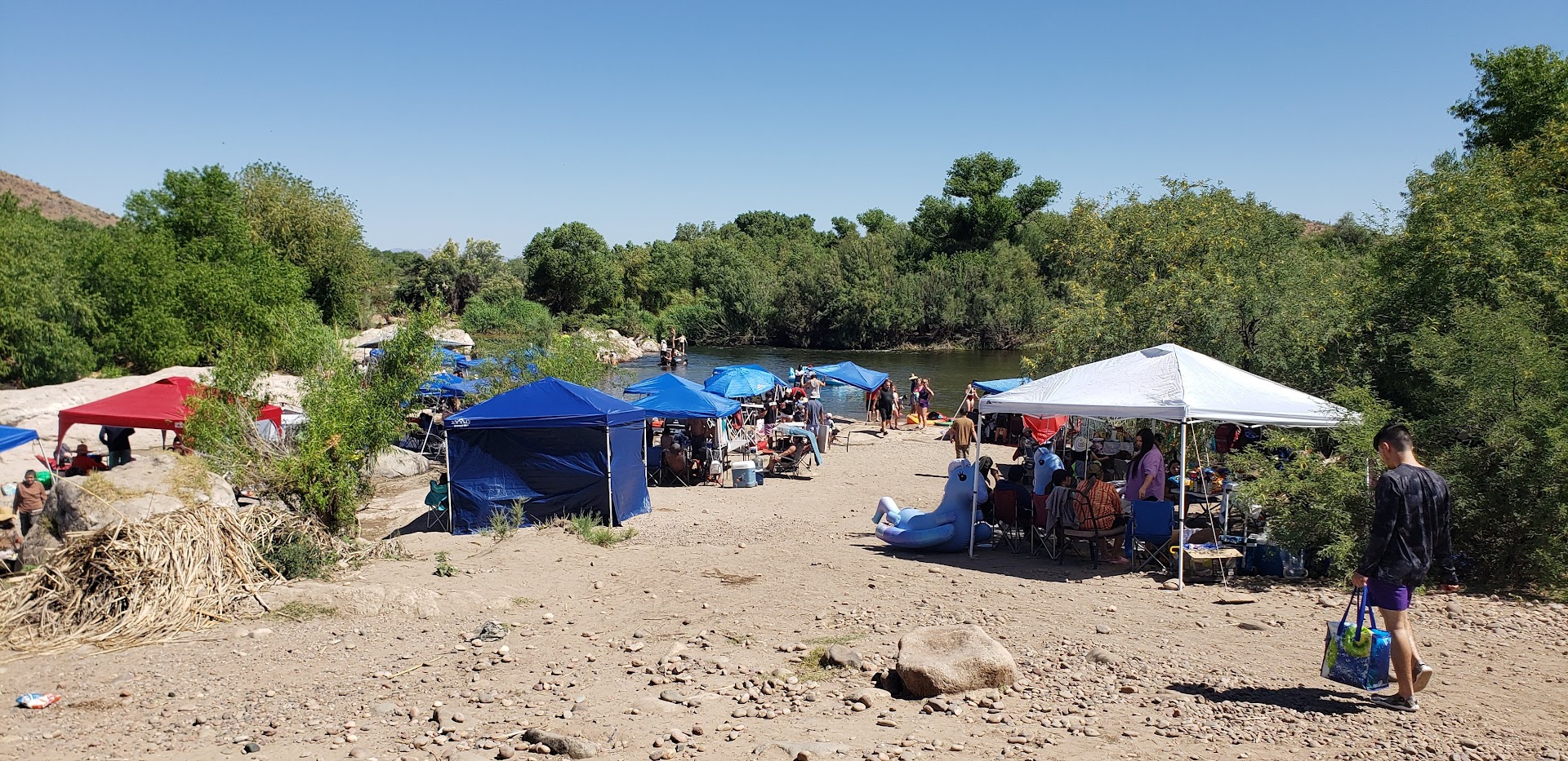 This area is a frequently used spot for beer fueled picnics and is the last stop for private tubers and kayakers. Expect to hear many languages and types of music. Daisydukes and bikinis are the fashion here. Tops and bottoms are ending up here among the garbage with flip-flops and hats.
