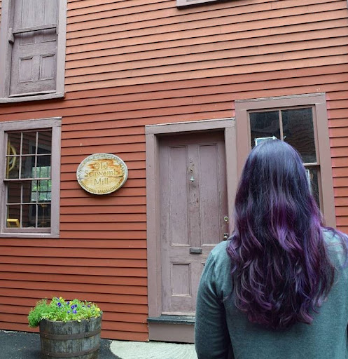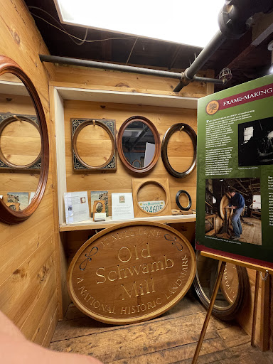 Old Schwamb Mill is the nations oldest continuously operating mill site.. Originally a gristmill, this has been a workingplace since 1650. Its documented history of operation dates back to about 1684. It was bought by Charles & Frederick Schwamb, two brothers from Rhinehessen, Germany, in 1864 when it would become an Oval Photo Frame shop. They set up this state-of-the-art woodworking shop, combining water power from the Mill Brook with an 18 foot diameter water wheel & a belt-driven pulley-operated system of machines to produce the highest quality oval & circular frames.