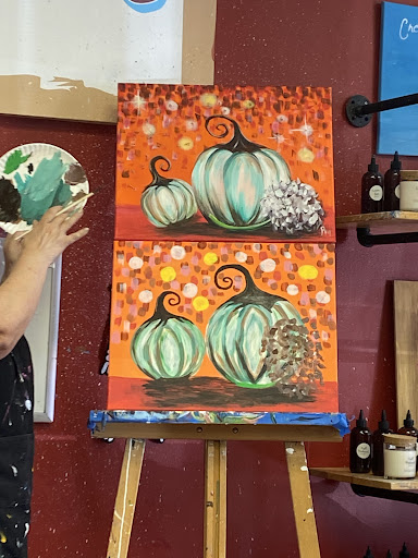 In the photo, the bottom painting was the instructor’s final product. We were all lost to say the least. If you’ve ever painted here before, the instructors painting is usually identical to the model one or the one posted online when booking. Completely different techniques used in each painting so we all had this striped pumpkin with...