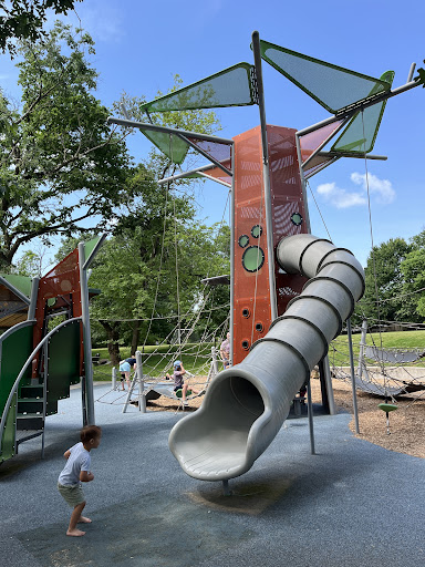 Nice shaded park with a very cool, nicely designed and consistently engaging multi-faceted climbing structure for kids of various ages and abilities to enjoy, plus a smaller play area with a more traditional wooden play set for the younger children and/or those seeking calmer, lower key play activity for any reason. A covered picnic area with several tables and benches located right between the two play areas provides excellent visibility for caregivers keeping track of kids playing on both sides and serves as a perfect snack/rest spot or pre/post playtime picnic location. Itโs also great for small birthday parties and other gatherings.