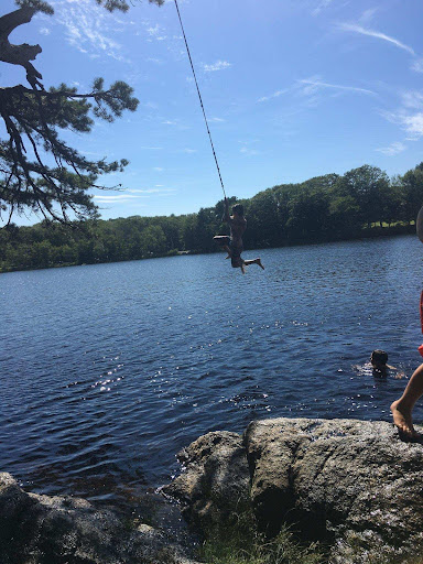 I almost don't want to reveal anything about this place so as to keep it a secret. But it's on a main road and easy to find, so the secret's not keeping itself anyway. Round the back on Old Stage Road there's a place to park and walk in through the woods to the pond. There's a rope swing on that side hanging from a pine my kids and I call Courage Tree, because that's what it takes to climb up and jump off into the water. We go many times every summer. Everyone we meet there is always friendly. People keep their trash picked up for the most part, but you will occasionally find some broken bottle glass in the water. Be...