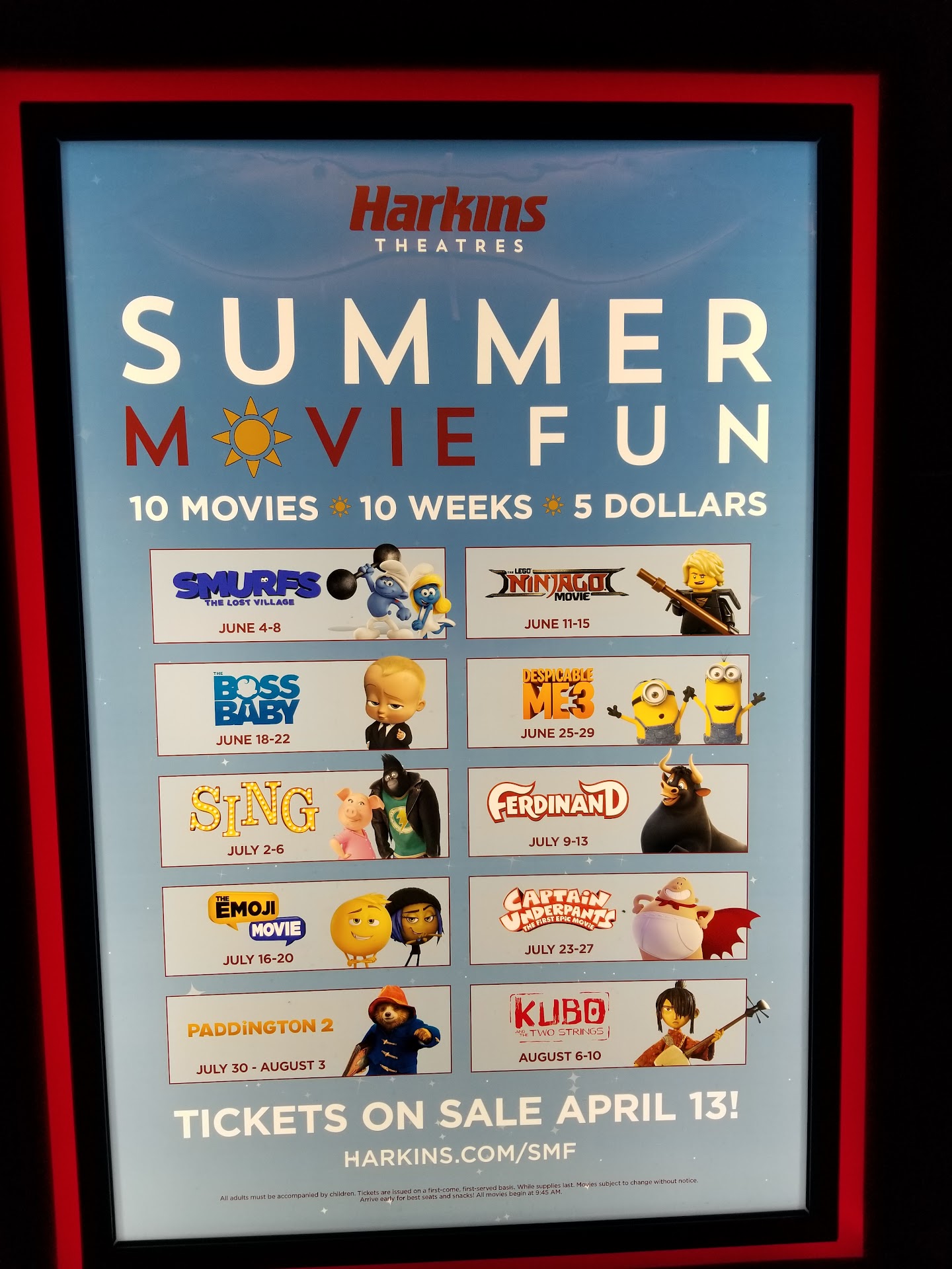 I love the environment of Harkins. They have lots of appearing standees and posters and the trailers played in the lobby. The building is very clean, including the restrooms, and the leather seats are wonderful. They have a bar in the lobby where you can take your drinks into the movies. Sometimes when I’m running late the concession crew will offer to bring my hot foods to me in the theater.