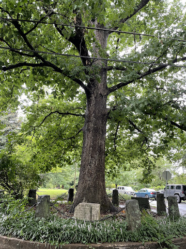 Plaque at the site, weathered by exposure; the stone faintly details a passage from William H. Jackson's deed to the tree.