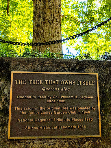THE TREE THAT OWNS ITSELF of Athens, Georgia, is a White Oak Tree that, according to legend, has legal ownership of itself and of all land within eight feet (2.4 m) of its base. The tree, also called the Jackson Oak, is at the corner of South Finley and Dearing Streets in Athens, Georgia, United States. The original tree, thought to have started life between the mid-16th and late 18th century, fell in 1942, but a new tree was grown from one of its acorns, and planted in the same location. The current tree is sometimes referred to as the Son of the Tree That Owns Itself. Both trees have appeared in numerous national publications, and the site is a local landmark.