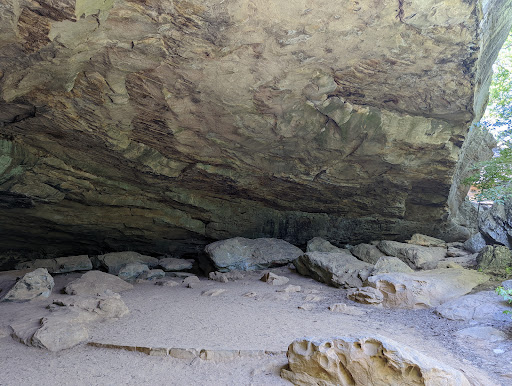 Rock House Cave is not a true cave, but a large rock shelter. It is also the premier spot in the state for viewing Native American rock art- created over 500 years ago. This trail also includes some of the most interesting geological formations in the park; Turtle Rocks. (Purple Blazes)