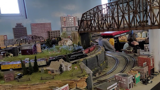 The walls were nearly floor to ceiling of model trains on display like in a museum. The floors were covered in boxes of model trains that appeared to be storage for their retail store. Noise came from the back room where, through a doorway, you could see and hear the model trains running. Stepping through that door, you see the room where my picture and video were taken. This is a very large room, with many long trains running on several different tracks through yards, mountains, over and under bridges. Very impressive.