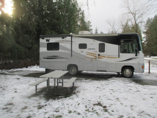 The park was easy to find but it is located about 10 miles from I 5. There is pavement all the way including in the park. Signage is adequate. Check in was friendly but took an unexpected turn. We had booked our site prior to our arrival. We were allotted site 1. The telephone attended noted that it would be long enough to suit our needs. We were informed by the Camp Host that they had given away site 1 and we would have to search another one that would fit our rig. Just an FYI, we are not all that long. Our coach is a short 28 feet. At first, we didn’t think it would be that big of a deal until we discovered that the sites were still snow covered and not all that easy to see how long they were. Plus, we really didn’t like the idea of us doing their leg work. We are not familiar with the park. After a long drive, all we wanted to do was set up and sit back. We were told site 6 might be vacant and we should fit so we decided to just take it. After disconnecting our Jeep and backing into the site we thought it was NOT a long site. We were as far back as we thought we should go. Any further looked like we might be on dirt. We stayed where we were as we were not going to walk the park looking for a longer site. We just parked our towed on the street (with the approval of the host). This was not a good start to our stay. The next morning we found that site 6 would have been long enough. What we thought was dirt was just snow covered ice.