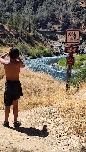 This old railroad bridge has large open side railings which a dog or small child could easily fall to their certain death. There are PEOPLE RIDING HORSES, next to people with dogs, and others with children, across a football field long, (and only about 10' wide!), bridge w no safety railings for dogs and small children? Even if your dog is on a harnessed leash; just imagine hanging onto that leash for your dogs life after he got spooked by the two massive horses 5' away with nowhere to go but under the railings (2' high)! I was less than halfway across w my 2 dogs when they started fussing; then the middle part is completely covered for about 60-70' in a puddle, which in order to get around, I'd have to have 2 dogs walking on the edges with me, within inches of certain death. Its completely unsafe and seems to be another example of the poor CA infrastructure on these type situations, as in with the Oroville dam spillway failure. This bridge is for adults on foot or bicycle, with waterproof shoes; and not pets or children until a tight lattice fencing is installed in the lower 2 feet of the side railings. Feel free to see for yourself. Be careful. My girl labs' brother, lost his life running ahead on a trail that was hundreds of feet above the Yuba river, falling from a 60' cliff at the rivers edge. There were no caution signs whatsoever, and not even a sign requiring dogs be leashed; coming from a well established campground area. If I'd seen a sign warning of the danger ahead, I'd never have had him unleashed, nor even gone down that trail. The only sign it had at the trailhead said, 'TRAIL'. Not worth your best friend's life. Other than the danger, this place...