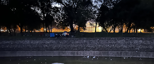 Homeless tents completely took over park, mainly on south side of park. Commonly walk my dog through the park. There are close to 25 tents now lining drainage runoff. There are over 100 articles of clothing lining the fencing, with tons of garbage, scooters, and camping pieces simply tossed into flood runoff area. This morning saw several campfires with people breaking branches off of nearby trees.