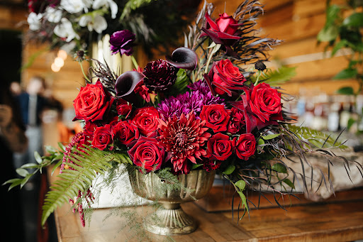 Our wedding vibes were dark and gothy, and in a beautiful open space with lots of existing greenery. We wanted rich reds and dark purples, with plenty of green accents and a few pops of white. I came to Michelle to design our dream goth pallet, and described my ideal wedding bouquet to her--white protea, deep purple calla lillies, ferns to remind me of my Pacific Northwest roots, and bridal bouquets matching my own. We had all sorts of floral dreams--centerpieces for our small cocktail tables, boughs for the bar and the stair rail, a lapel floral for my husband, and boutonnieres for our whole family. Michelle not only matched my vision, she knocked it out of the park. The flowers were incredible, and we got so many compliments. She even decorated, on site, a two-piece floral arch, AND transported all the florals from our wedding venue to the reception location for us! Truly above and beyond, would recommend Texas...