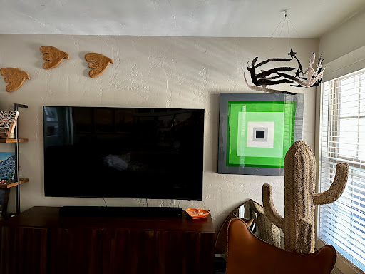 Low Key Rock Star - We were drawn to the colors and playful nature of the piece, and loved the scale and the bright pink low key rockstar. Our 76 year old neighbor dog/house sits for us and shared that every time she looks at it she notices something new.