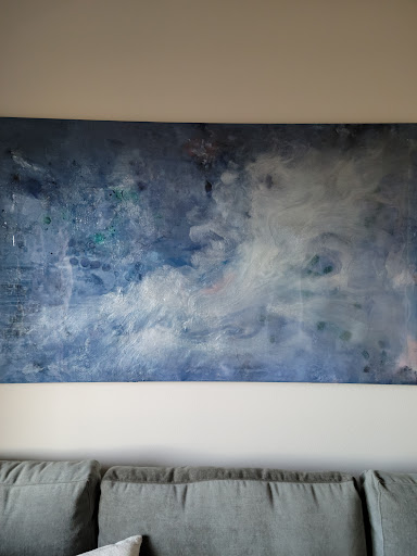 Fast forward and I needed a large piece to go over the living room couch. I looked at Julie’s website and found, “Get it Girl.” The colors matched the couch, the paint in a beautiful way. The amazing thing about this piece is it seems to change with the amount of light in the room. Sometimes the pinks burst with color, at other times they are very subdued. On rainy days, it seems to match the clouds outside. Julie’s ability to work with colors and layers of paint is the key to this transformation.