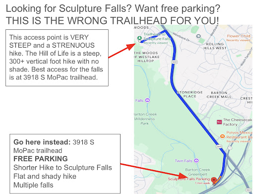 The hike from the 3918 S MoPac trailhead is much shorter to Sculpture Falls, and you don’t have to contend with the very steep Hill of Life. Also FREE PARKING at 3918 S MoPac...