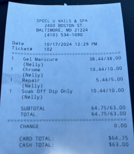 At checkout she attempted to charge me $13 for dip soak off only. Usually a charged described as this is reserved for only receiving a soak off and no other service. She reduced it to $10 explaining that if I had got a new dipping service there would be no charge but because I switched to gel there was a charge.