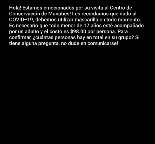 Read moreI should preface this review by noting that I absolutely love manatees and planned my trip to line up with when the center reopened following COVID restrictions. That said, I couldn’t recommend this experience enough. Our group signed up for the manatee caretaker for a day experience (it’s not really a day… only 2- 2 ½ hours) and it was a wonderful experience. At the time we visited, they had three adorable manatee calves, resident adult Guacara, and a menagerie of other animals. Just the chance to be so close to manatee calves is a once and a lifetime experience that I won’t forget and it is topped by the opportunity to help prepare the food and feed Guacara (an interaction that understandably isn’t permitted for non-resident manatees for their safety and security and is incredibly rare to find). Because of some of the efforts to help with Guacara’s veterinary care, we also got to see his gigantic personality (like putting his nostrils at the surface of the water to get food after learning the behavior for COVID tests).