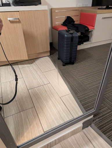 The room included a microwave, small refrigerator, a Keurig coffee maker, and an open closet with hangers, a luggage rack, iron, and ironing board. The foyer area had tile flooring, while the rest of the room was carpeted in standard hotel carpet—nothing remarkable. However, the hallway carpet on the fourth floor stood out with a beautiful, cosmic-style pattern that reminded me of the night sky. I usually don’t even notice hotel carpets, but this one was genuinely attractive.