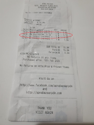Read moreHorrible, careless and unhygienic service!!!! I had a very bad experience with my recent order. I got an open frozen package and upon calling the owner he agreed to refund back and asked me to send it back with the same delivery person. Upon following up about the refund the owner is denying about the refund and not even bothered to follow up on my request. By far the worst and irresponsible service I have ever experienced from apna bazaar. The merchant in the first place he didn't agree to take back and after mentioning that I can't accept a opened frozen food which is unhygienic and is a careless service the merchant is not even sorry for the negligence and now not even willing to refund or follow up on it. And yeah now we don't have the product and lost the money as...