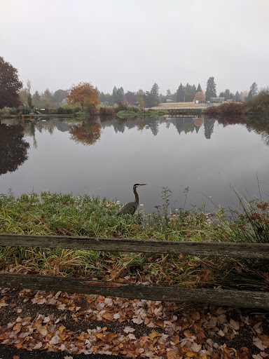 Depending on the season you may see: Canada Geese, Blue Heron, Egret, Nutria, Bullfrog, various species of ducks, and more. There's also a Barred Owl who lives nearby in Foothill Park.